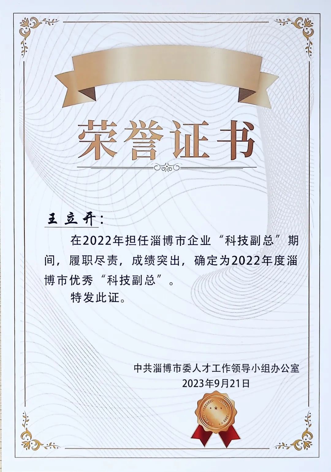 2023-10-09優(yōu)秀!金科力公司“科技副總”王立開獲表彰